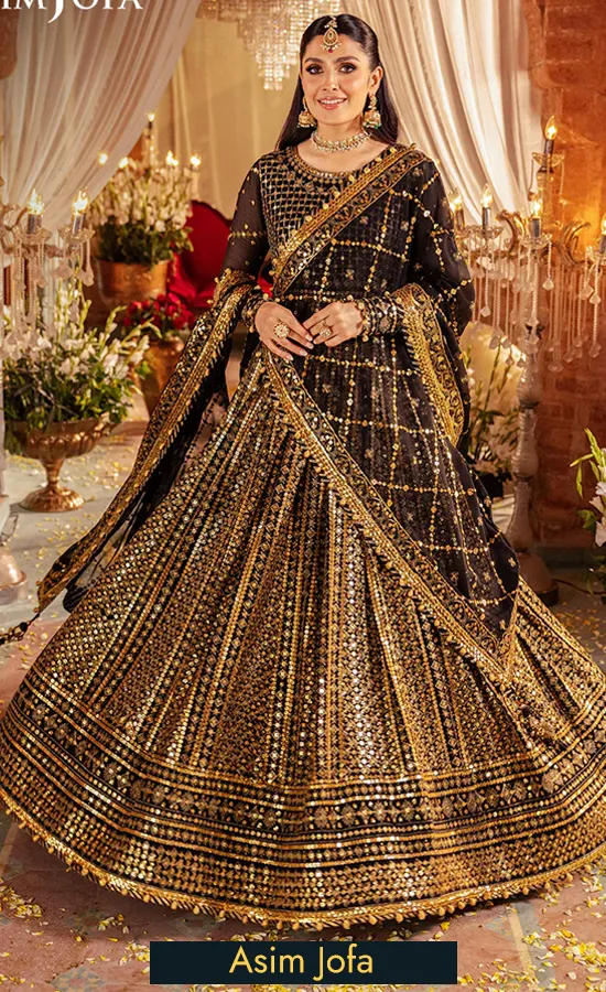Behold the enchanting beauty of this peshwas from Asim Jofa’s “Jaan-e-Jahan Chiffon Collection” where craftsmanship meets elegance in a symphony of gold and black. The antique gold zariwork adorns along with dark gold 9mm and 3mm sequins on velvety black fabric with mesmerizing motifs. Floral and geometric patterns intertwine and create a canvas of timeless elegance. Against the black backdrop, the gold embroidery shines like hidden treasures waiting to be discovered making this ensemble a captivating choice for weddings, cultural events or grand soirées where it commands admiration and whispers of awe.