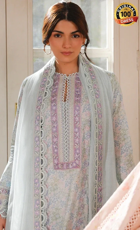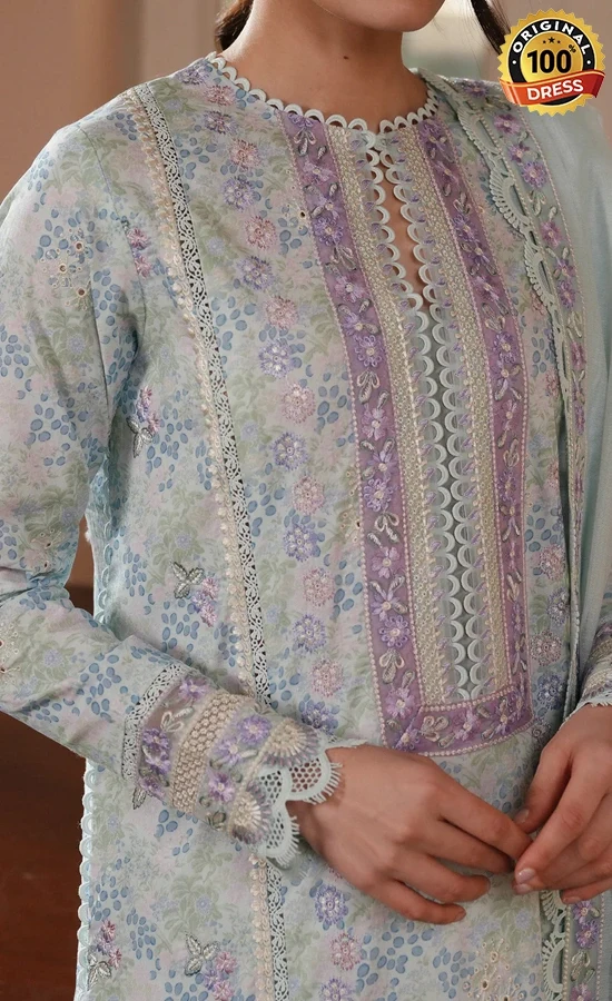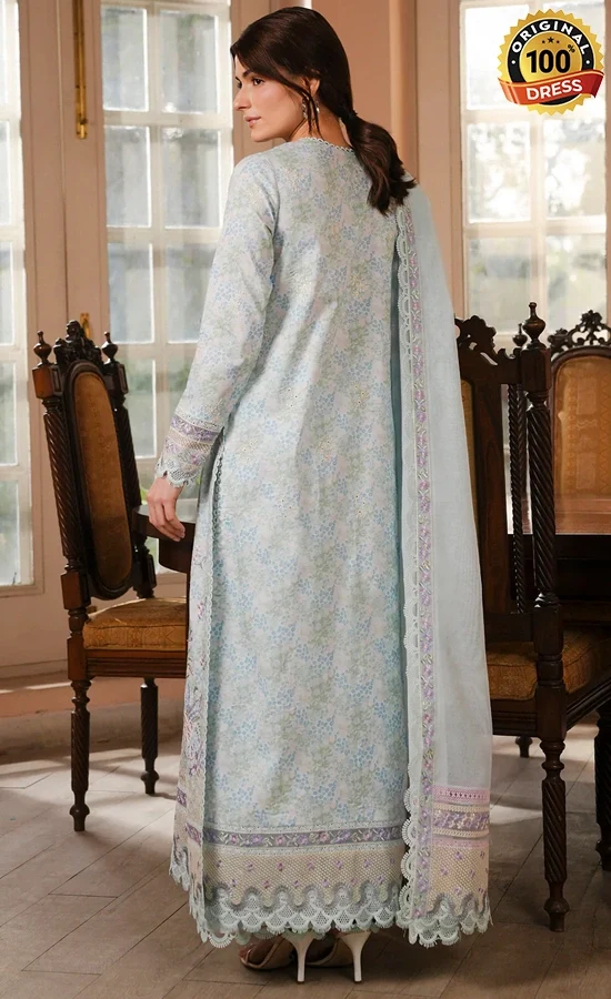 - Digital printed embroidered front center panel 1 pc powder blue printed lawn