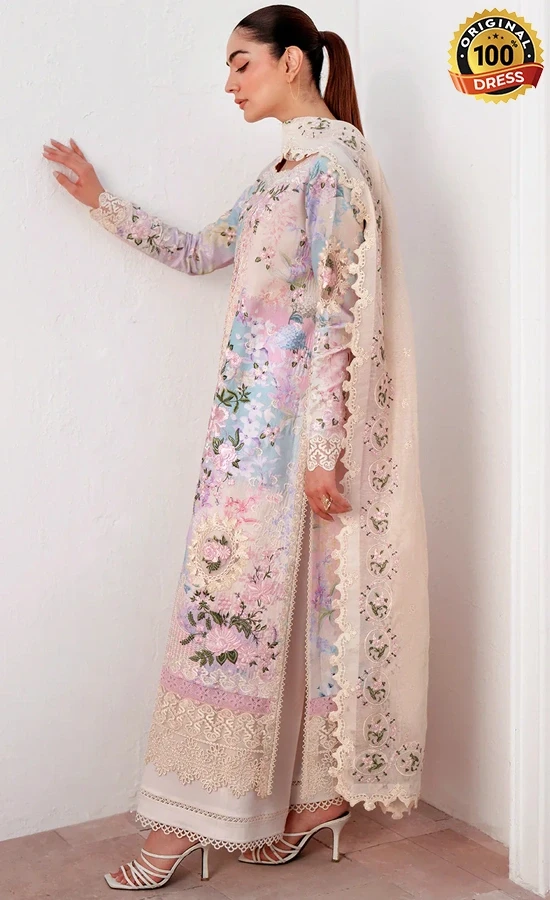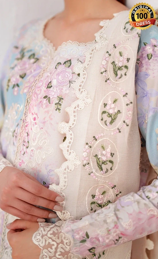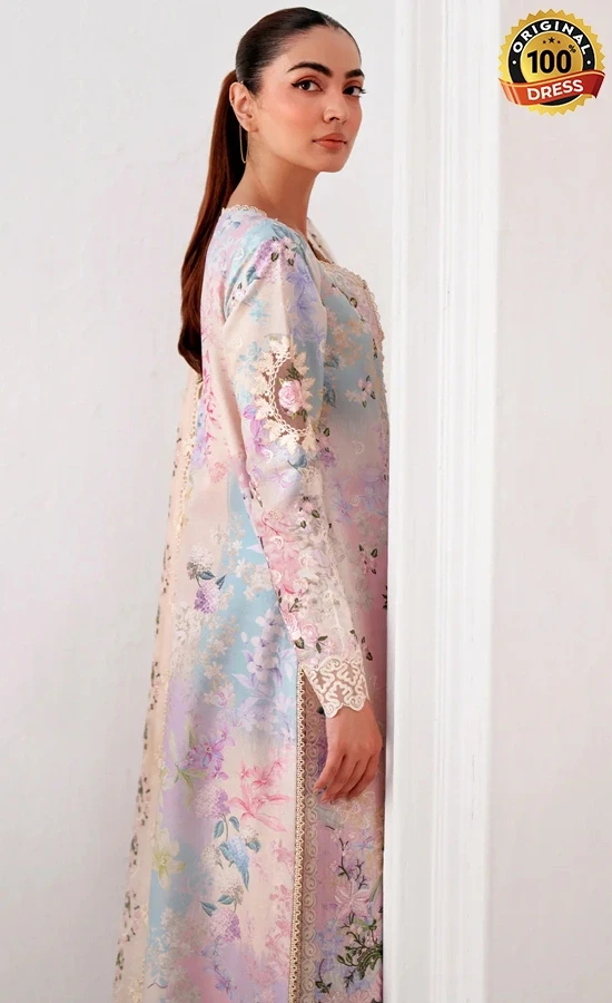 - Digital printed embroidered front 1pc pink/blue printed lawn